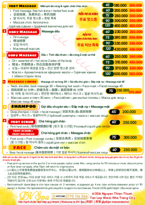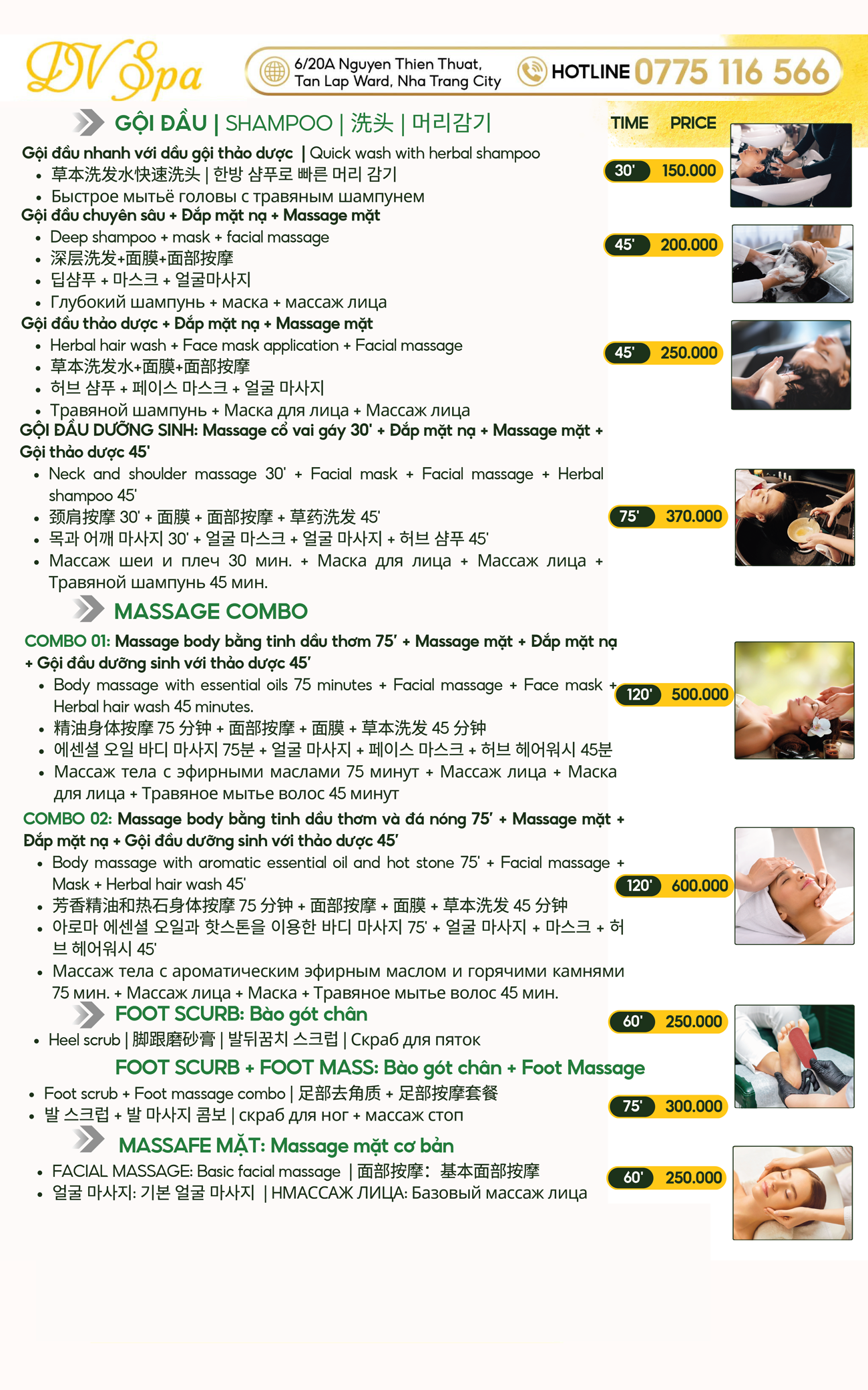 With the mission of bringing absolute relaxation to both body and mind, DV Spa devotes its passion and highest standards to every service. From foot massage therapies combined with herbal foot soaks, full-body treatments with aromatic oils and hot stones, to special spa combos including relaxing hair wash, facial masks, and intensive massages – every experience is carefully designed to provide you with deep relaxation, refreshment, and revitalized energy.